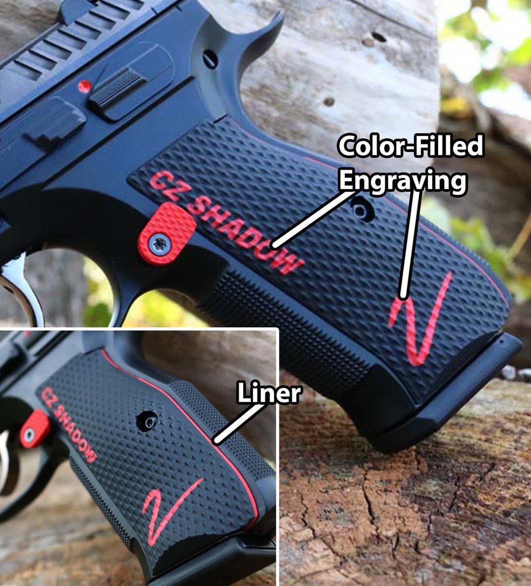 How it works: We engrave the logo pocket into the grip. Next, we machine the logo out of another piece of G10 (same material grips are made of). Then, we insert the G10 logo into the machined pockets and they are held in place with a super strong epoxy.